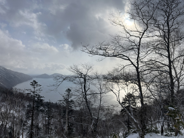 急登終わってから暫く歩いてると、支笏湖の反対側、黒い雲がすごい速さで動いている…