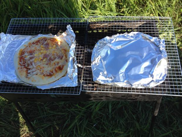 とりあず朝食。メニューは冷凍ピザのアルミホイル焼き。右側が焼いてる途中、焼きあがったら左。